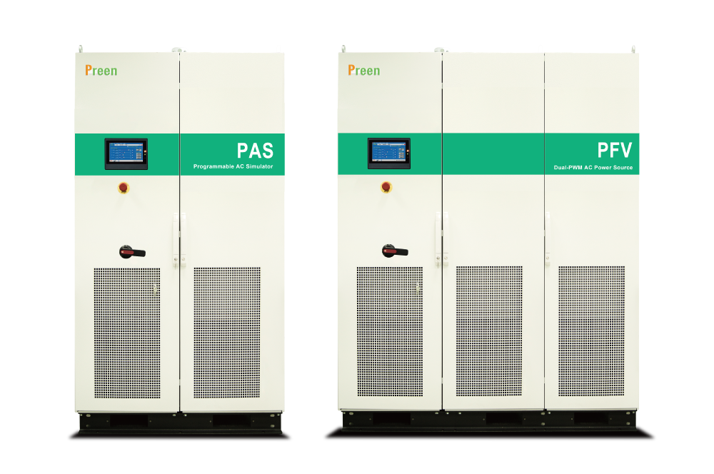 PAS 系列单机最大输出功率可达2000kVA,PFV 单机最大输出功率可达400kVA,输出电压范围皆为0-300V,输出频率为45-65Hz 连续可调或选配40-70Hz 连续可调,通讯介面为RS-485 / RS-232 或选配GPIB、Ethernet、USB,更有标配或选配的三相独立可调、相位角可调、及能源回馈功能。